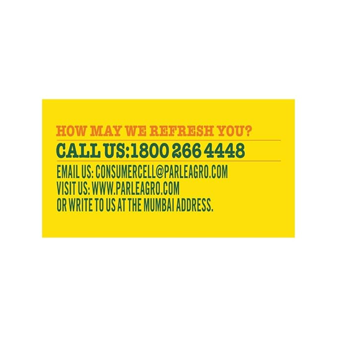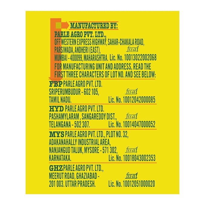 Manufacturer Contact Information Parle Agro Pvt Ltd, Off Western Express Highway, Sahar Chakala Road, Parsiwada Andheri East, Mumbai 400099 Tel 022 – 6734 8000
