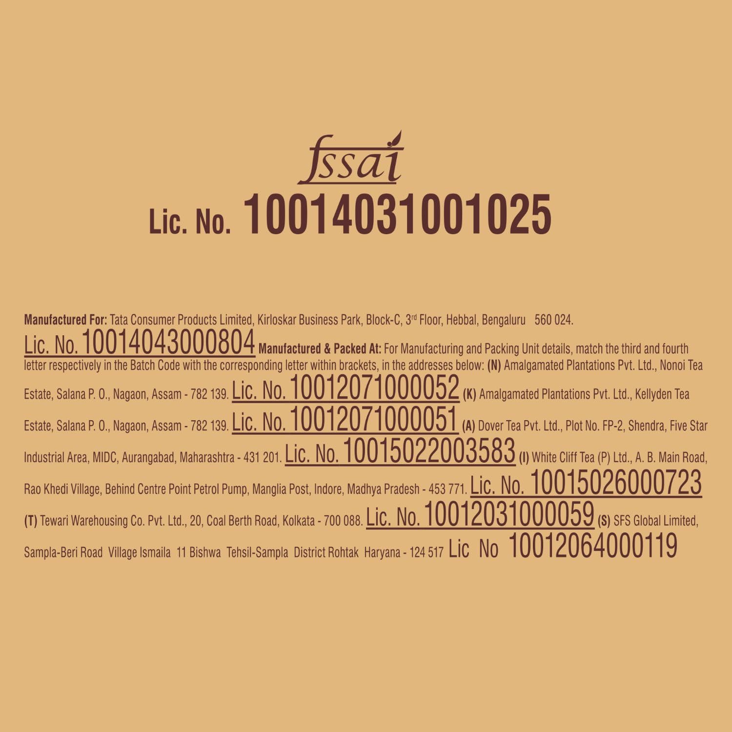 | Manufacturer | Tata Tea, Tewari Warehousing Co. Pvt. Ltd., 20, Coal Berth Road, Kolkata-700088 |